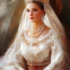 A bride in an ornate gown adorned with intricate gold embroidery sits elegantly. She wears a stunning necklace and tiara, her veil cascading beautifully, and holds a bouquet of white roses.