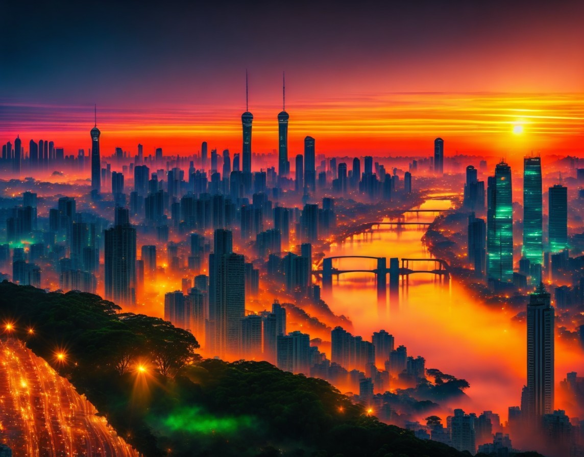 Aerial cityscape at sunset with vibrant orange sky, silhouettes of skyscrapers, and illuminated streets.