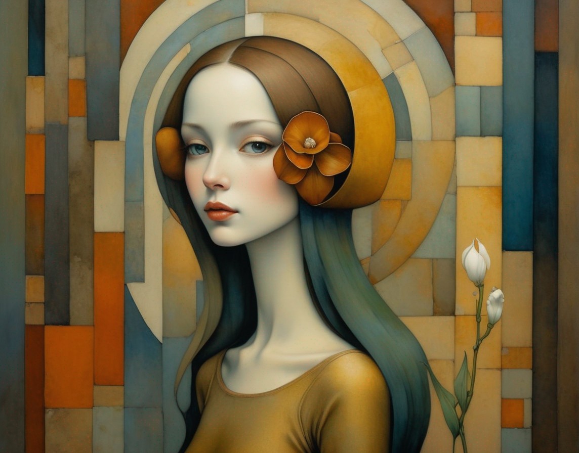 A painting of a serene woman with a halo, blue hair, orange flowers near her ears, and white flowers on her right, against an abstract backdrop.