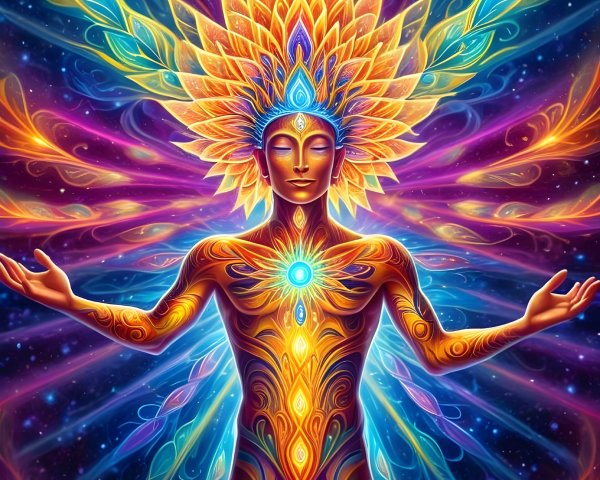 A stunning figure with flowing hair and large, white wings stands gracefully in a lush, mountainous landscape. Dressed in a shimmering blue gown adorned with jewels, she exudes elegance and strength.