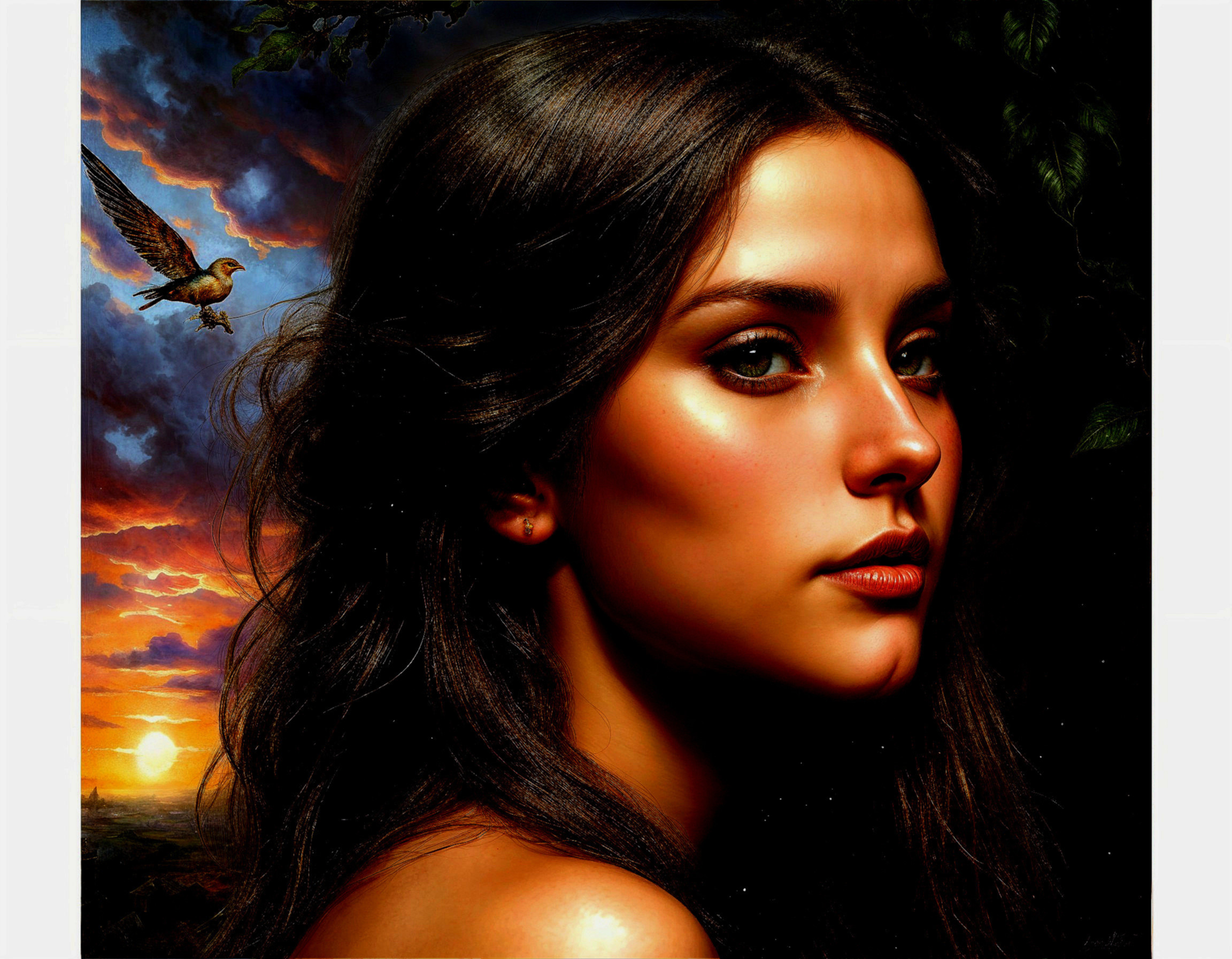A highly detailed and surreal artwork featuring a beautiful woman in a short dress praying alongside a warrior in a chaotic, ruined house filled with angels, birds of paradise, and snakes. The scene includes a stormy sky, raining fire, white flowers with diamonds, and a cinematic light setting, reminiscent of famous artists' styles.