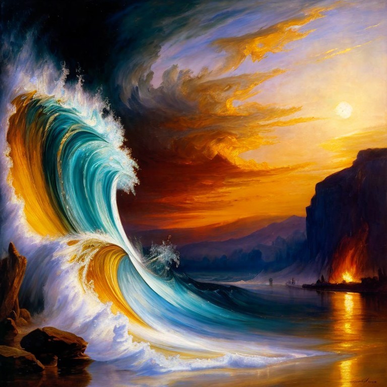 Dramatic painting of massive wave, swirling sky & erupting volcano