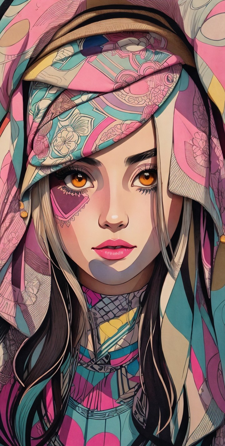 Woodblock print, stylized lineage forms Female face with wool cap she wears a shirt with colorfulstripes, beautifuleyes, realistic textile texture, line-art in anime style, tints of graffiti art, high coloring, brightness 1.9, triadic color scheme beige pink mauve, stylized watercolor and ink illustration, upper body portraiture, hues, traumacore, american gothic 1.7, soft rounded edges, fine strokes, encoustic ochre streaks, octane render, Geometrical colorful portrait of a female rapper, graffiti art in style of Bob Eggleton, brightness 1.4, high coloring 1.7, geometrical illustrative style,, vector 9:5, intricate stylized hairstyle, zentangle method, dry brushed paint, grunge, spiritual essence, dynamic lighting 1.7, 3d effects 1.8, ambient occlusion 1.5, anisotropic filtering 1.7, ethereal, muted colors, plasticity 1.9, stylized lineage illustration, geometrical features, octane render, raytraced shadows 1.8 ,sublime, sore, strict, synthetic, illustrative maximalism, bright lighting from top to centre, stylized illustration 1.5, beautiful composition 1.9, gorgeous, sober, dense, kinetic, neat,