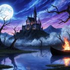 A haunting scene depicts a moonlit castle atop a rocky hill, surrounded by dark mountains. A small boat floats on misty waters, with eerie trees framing the landscape and a flickering fire illuminating the night.