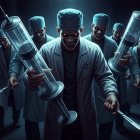 A sinister figure in a lab coat holds giant syringes and knives, surrounded by eerie, menacing versions of himself. The atmosphere is dark and foreboding, evoking a sense of horror and tension.