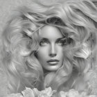 A striking monochrome portrait of a woman with flowing, wavy hair adorned with delicate flowers, her captivating gaze and serene expression create an ethereal, dreamlike quality.