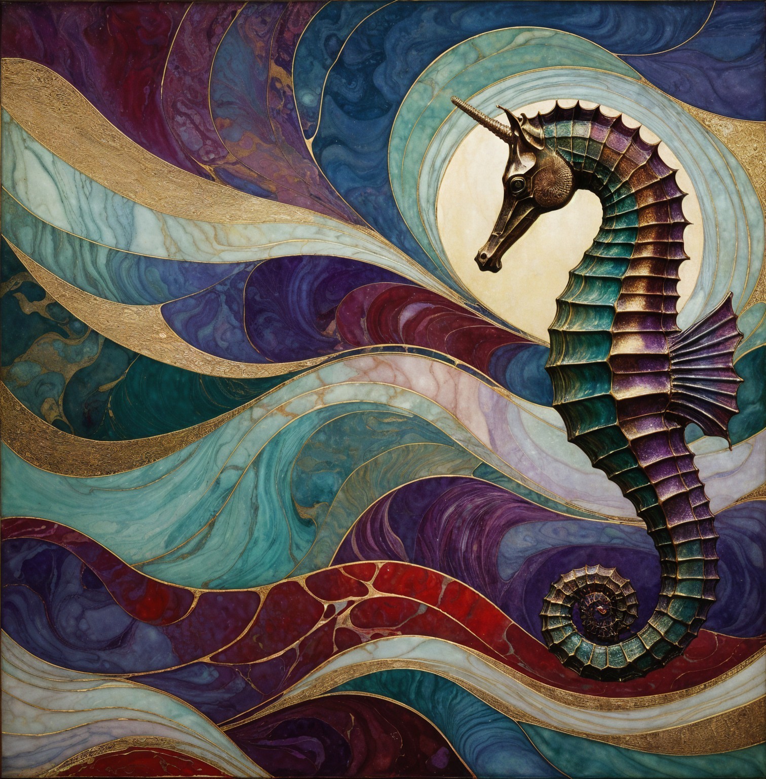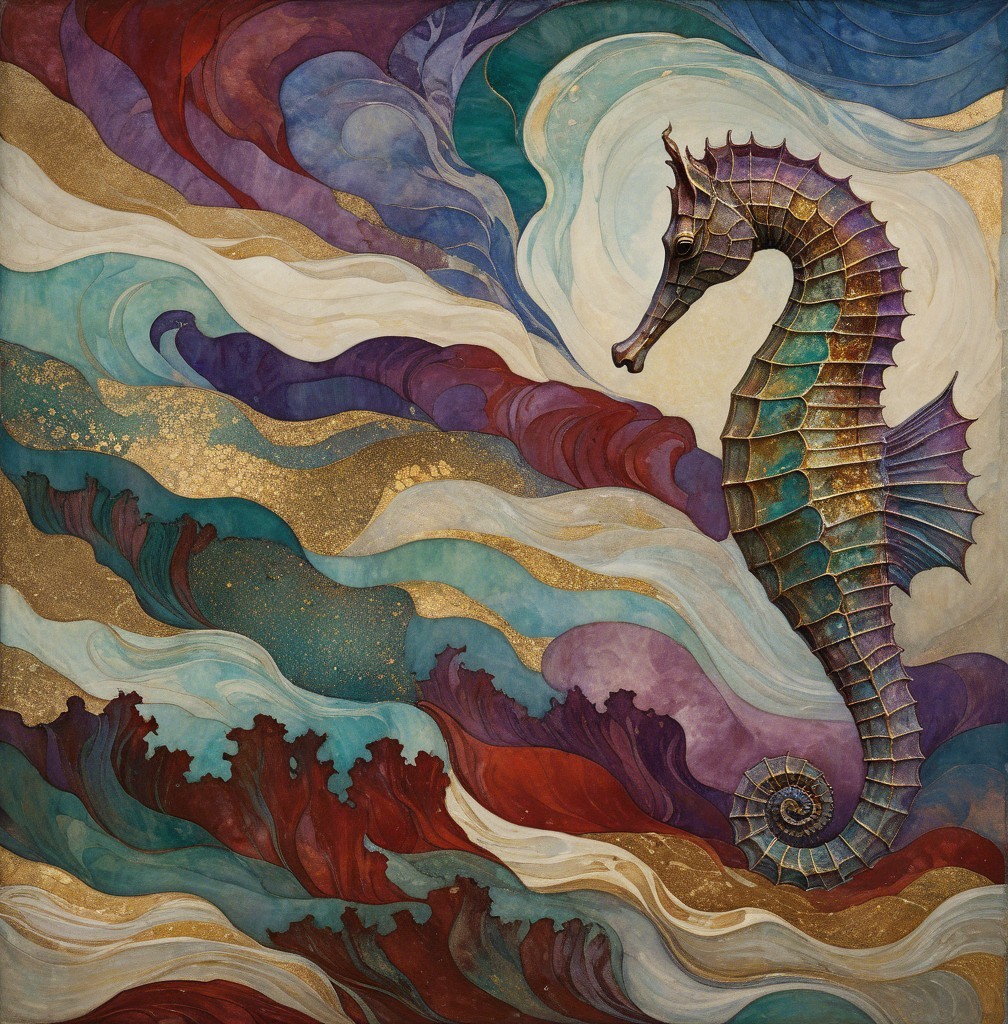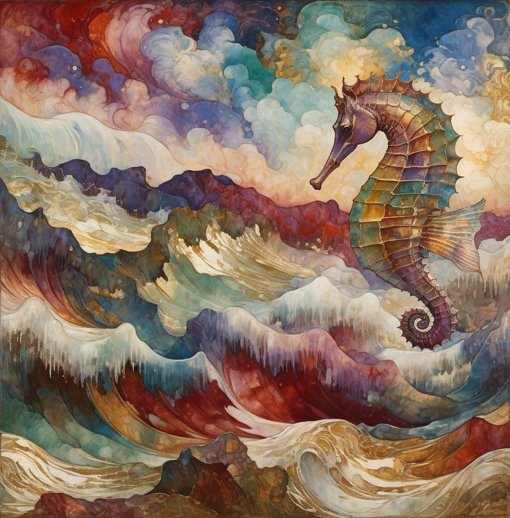 The artwork features a intricately designed seahorse in gold, set against a vibrant background of swirling colors, including deep blues, purples, and reds, creating a sense of movement and elegance.