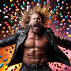 A muscular man with long hair screams passionately against a vibrant, swirling background of colorful patterns, creating an intense, energetic scene filled with motion and emotion.