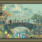 A whimsical Halloween scene features a dark bridge with a haunted house, bats flying around, and decorative swirls in orange and black, set against a muted green background with full moons.