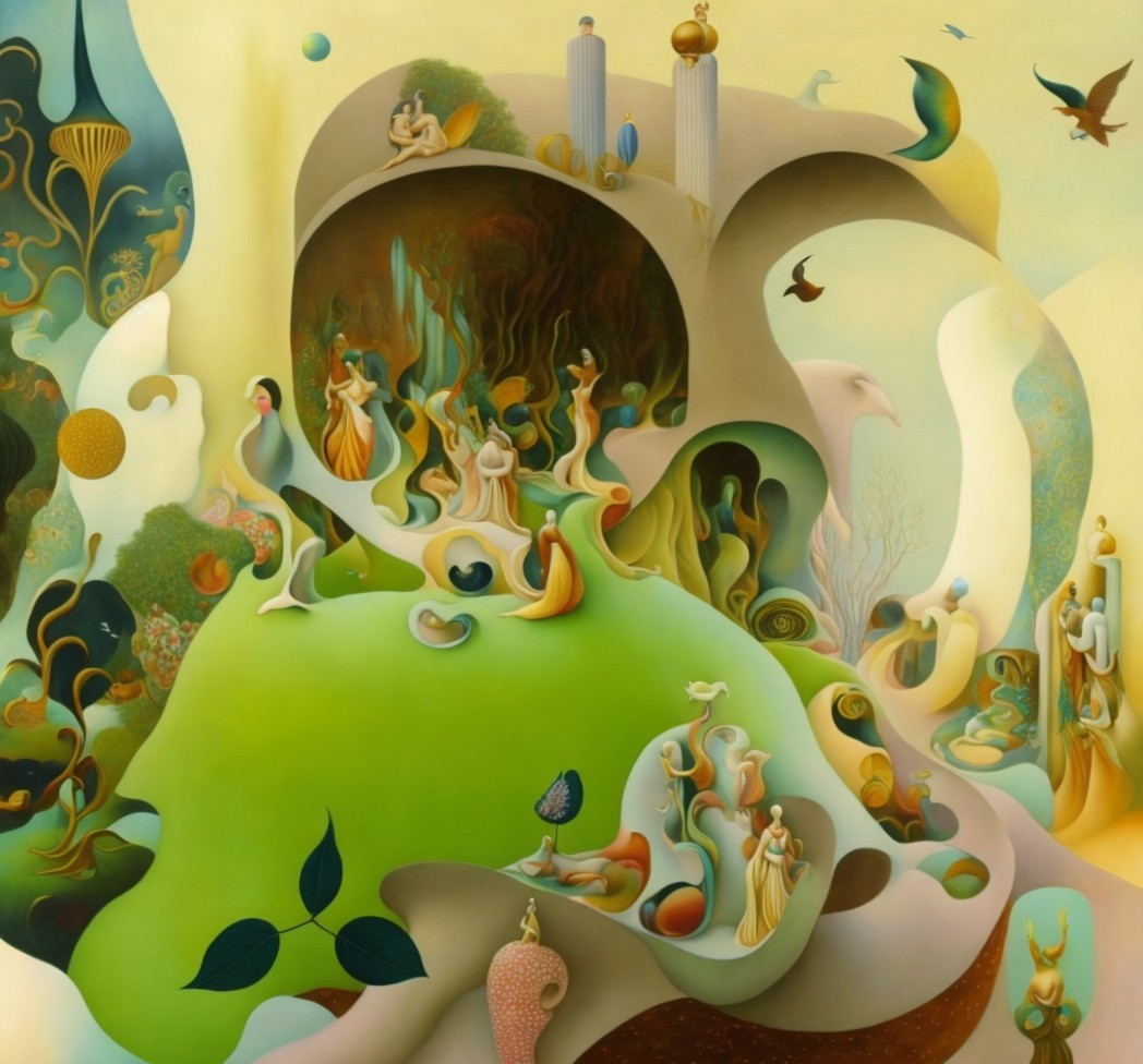 The image features an abstract, dreamlike composition with swirling colors and organic shapes. A figure adorned with a flower stands amidst vibrant greens and swirling patterns, evoking tranquility and enchantment.