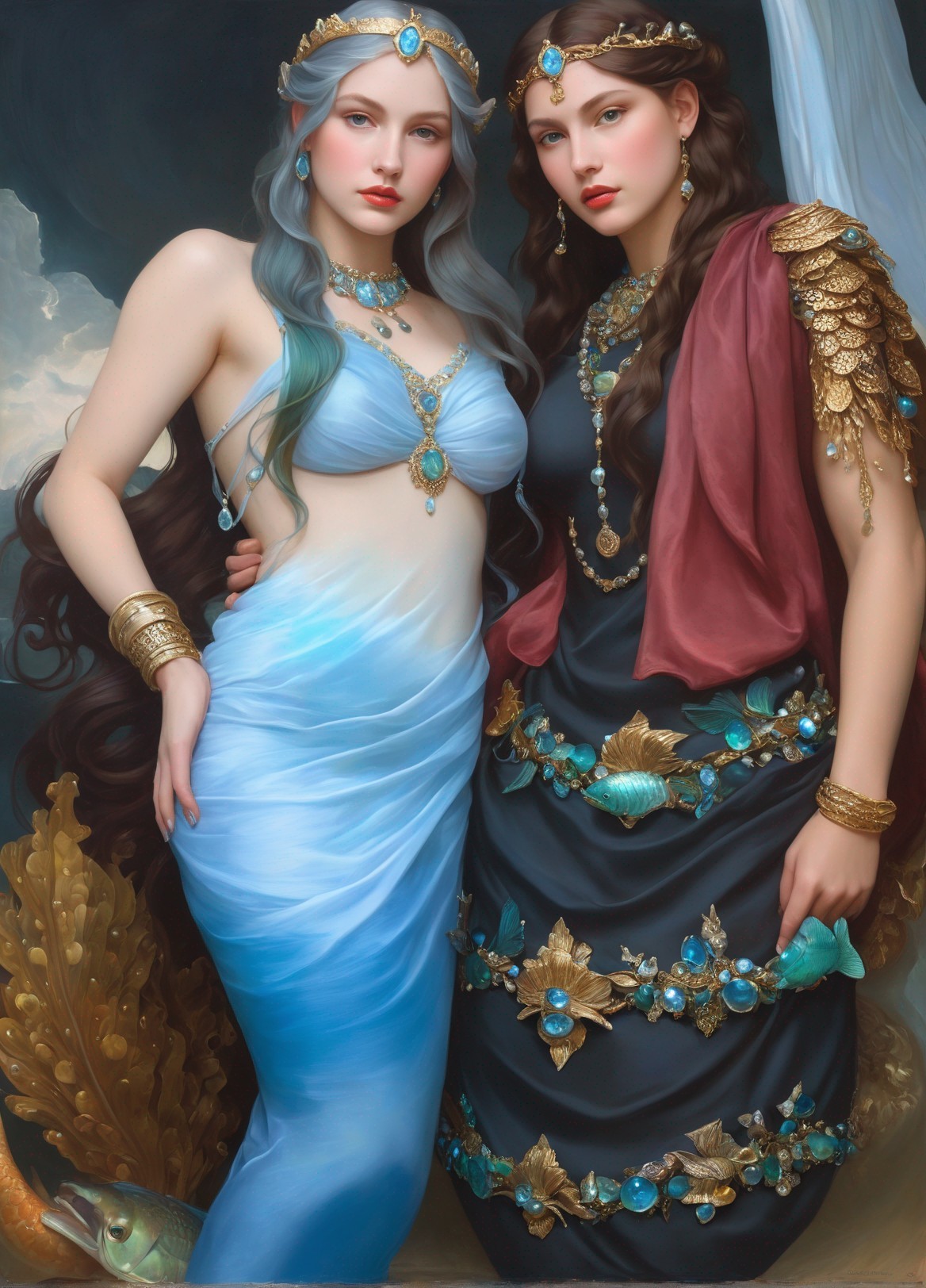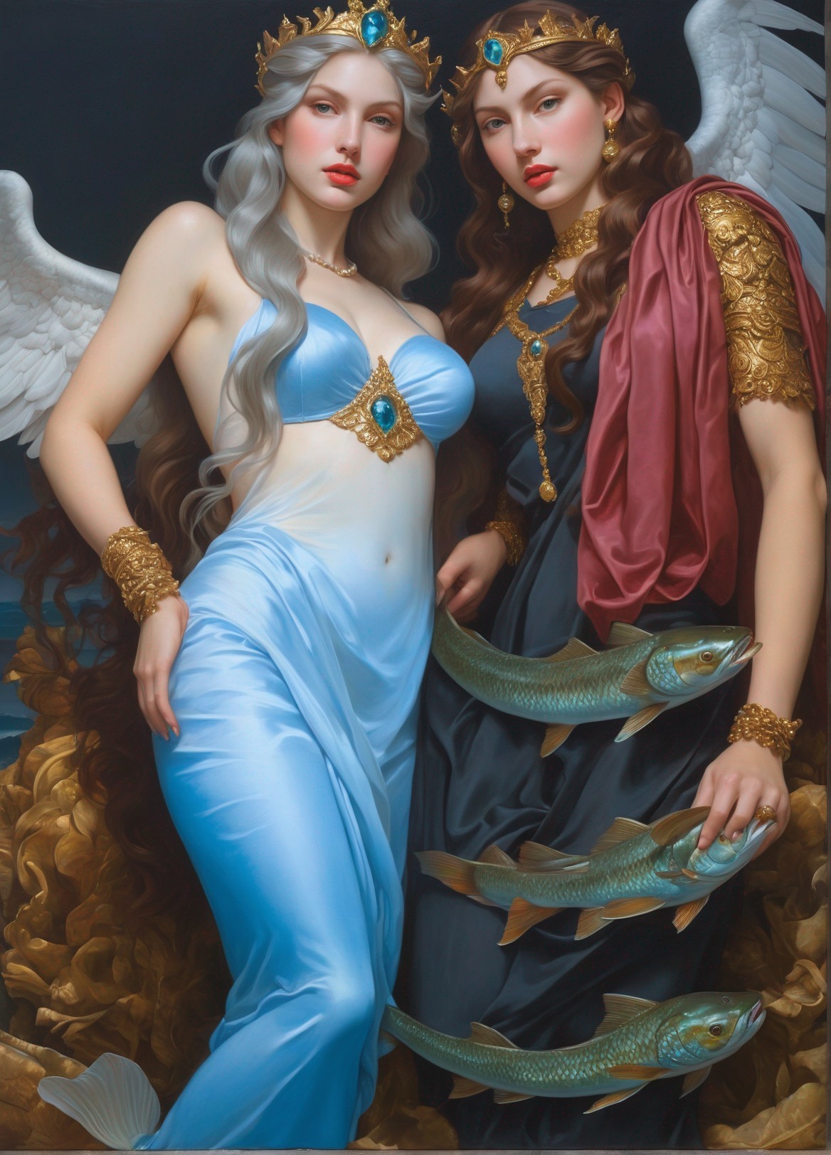 A painting of three ethereal women with angelic wings, adorned in regal attire and golden crowns, exuding an aura of grace and nobility.
