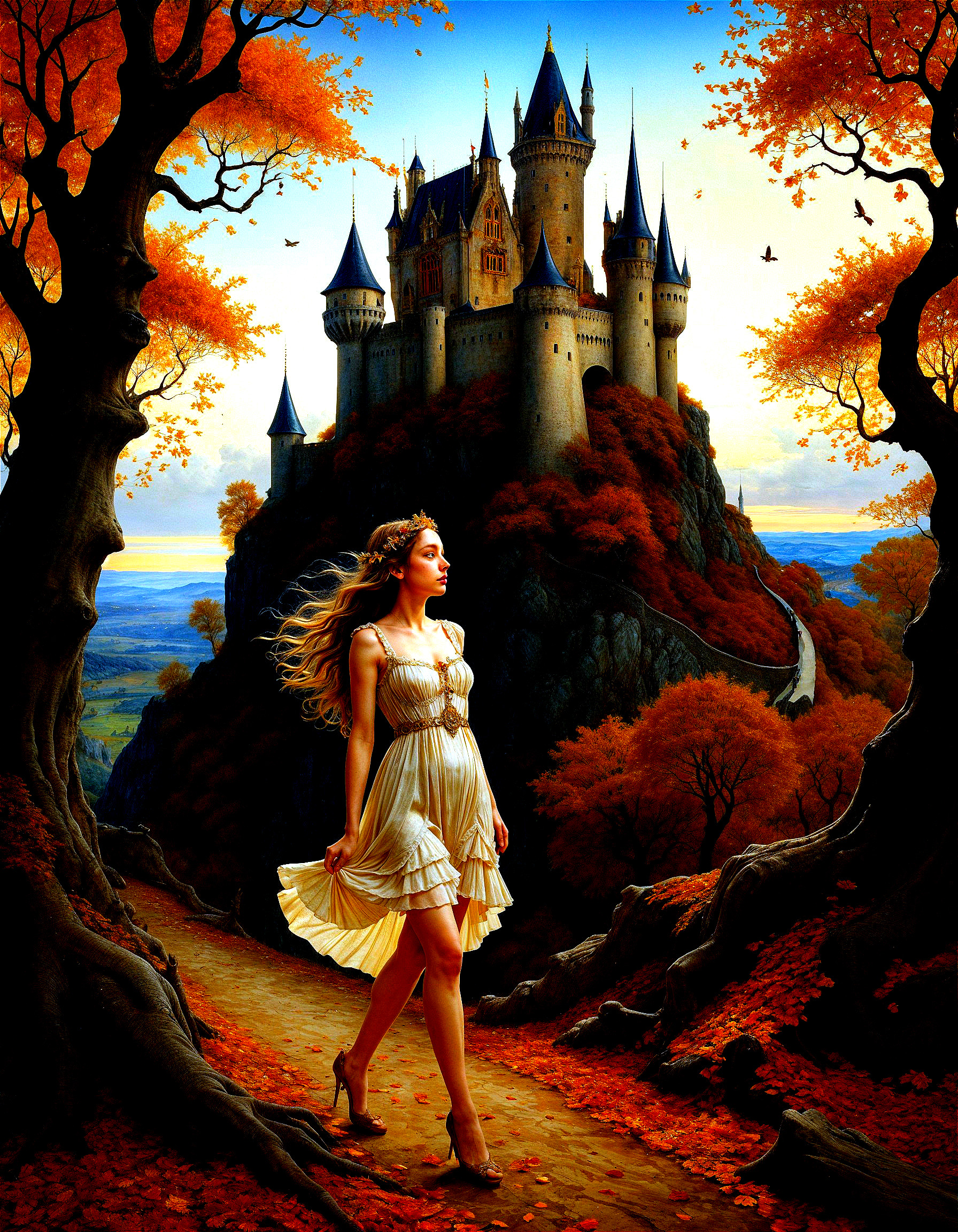 A stunning surreal depiction of a beautiful elf in a short, ornate dress, running through a fairy castle amidst autumn oaks, illuminated by multiple moons and a thunderstorm. This hyper-detailed fantasy scene features intricate elements, muted colors, and dynamic lighting, creating an enchanting atmosphere.