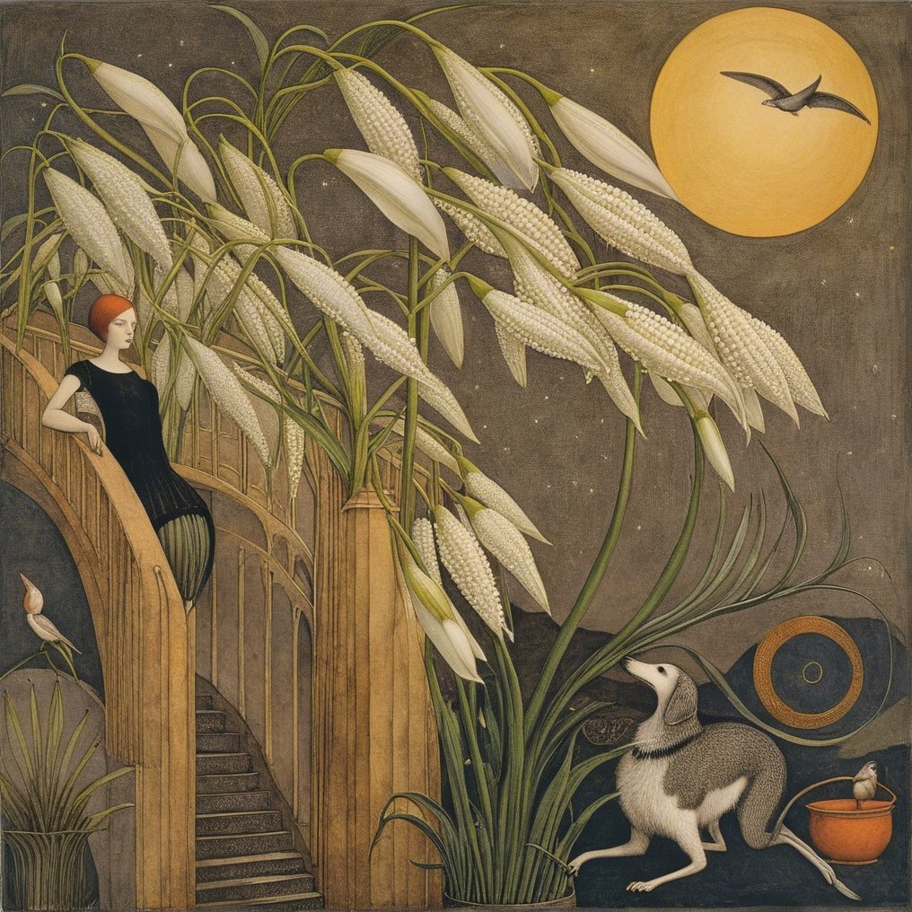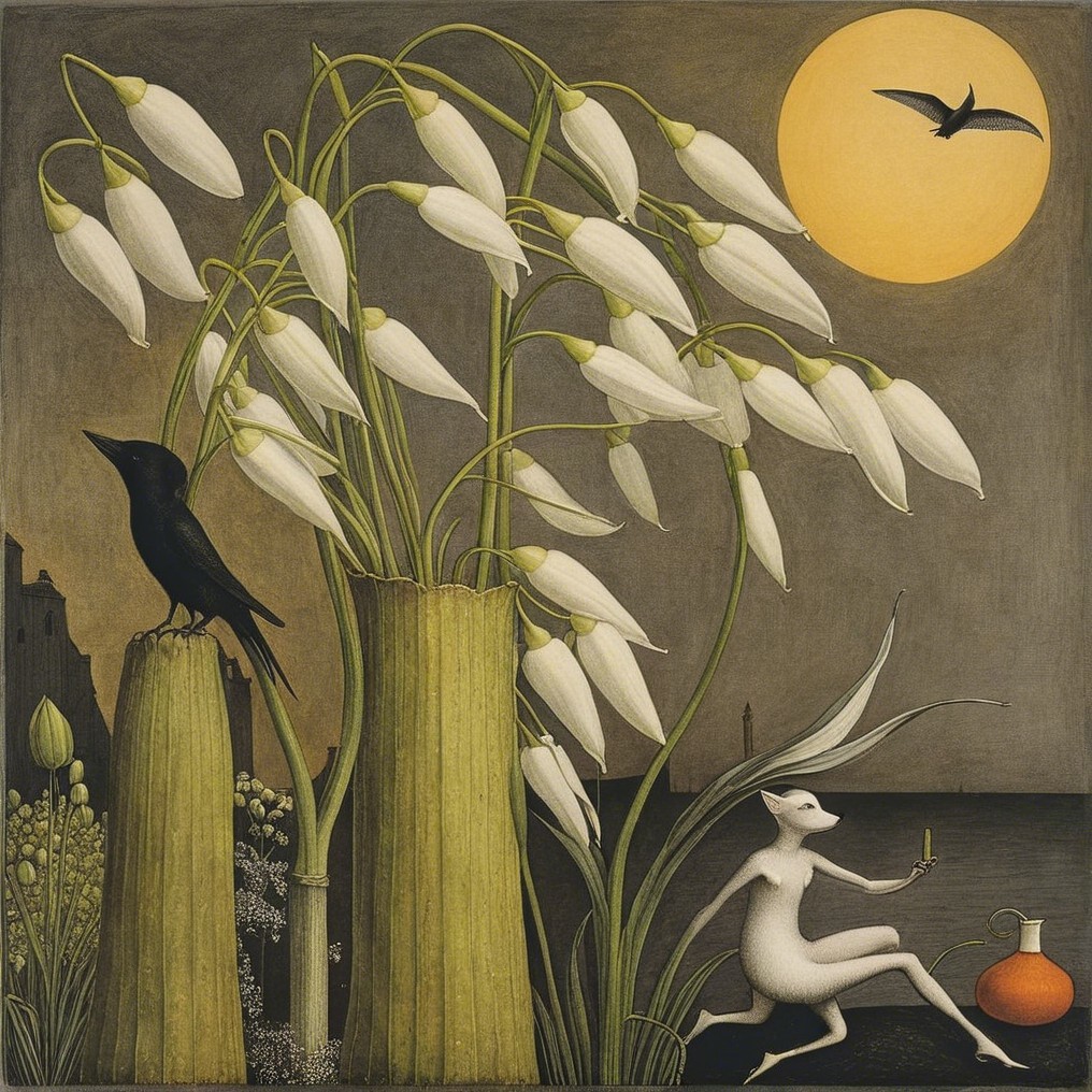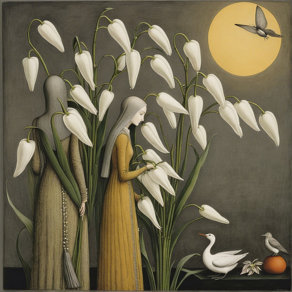 A whimsical scene features a girl in a yellow dress standing among large white flowers, gently interacting with a white bird under a full moon, with a black bird perched nearby.