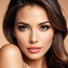 A close-up portrait of a woman with luminous skin, warm brown eyes, and soft, wavy hair. She has a natural makeup look, highlighting her features against a smooth, warm background.