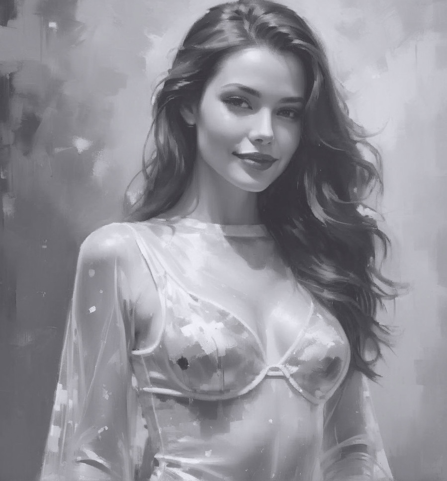 A monochromatic portrait of a woman with long, flowing hair. She wears a sheer, elegant top, exuding confidence with a subtle smile against a blurred abstract background.