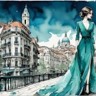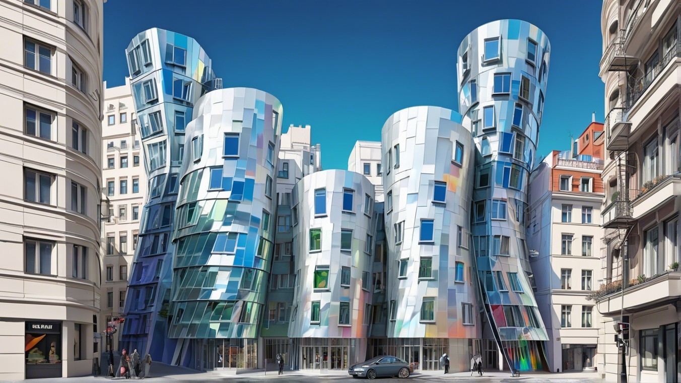 The image features an architecturally striking building with curved, reflective facades in various colors. It's set against a clear blue sky, surrounded by traditional city structures.