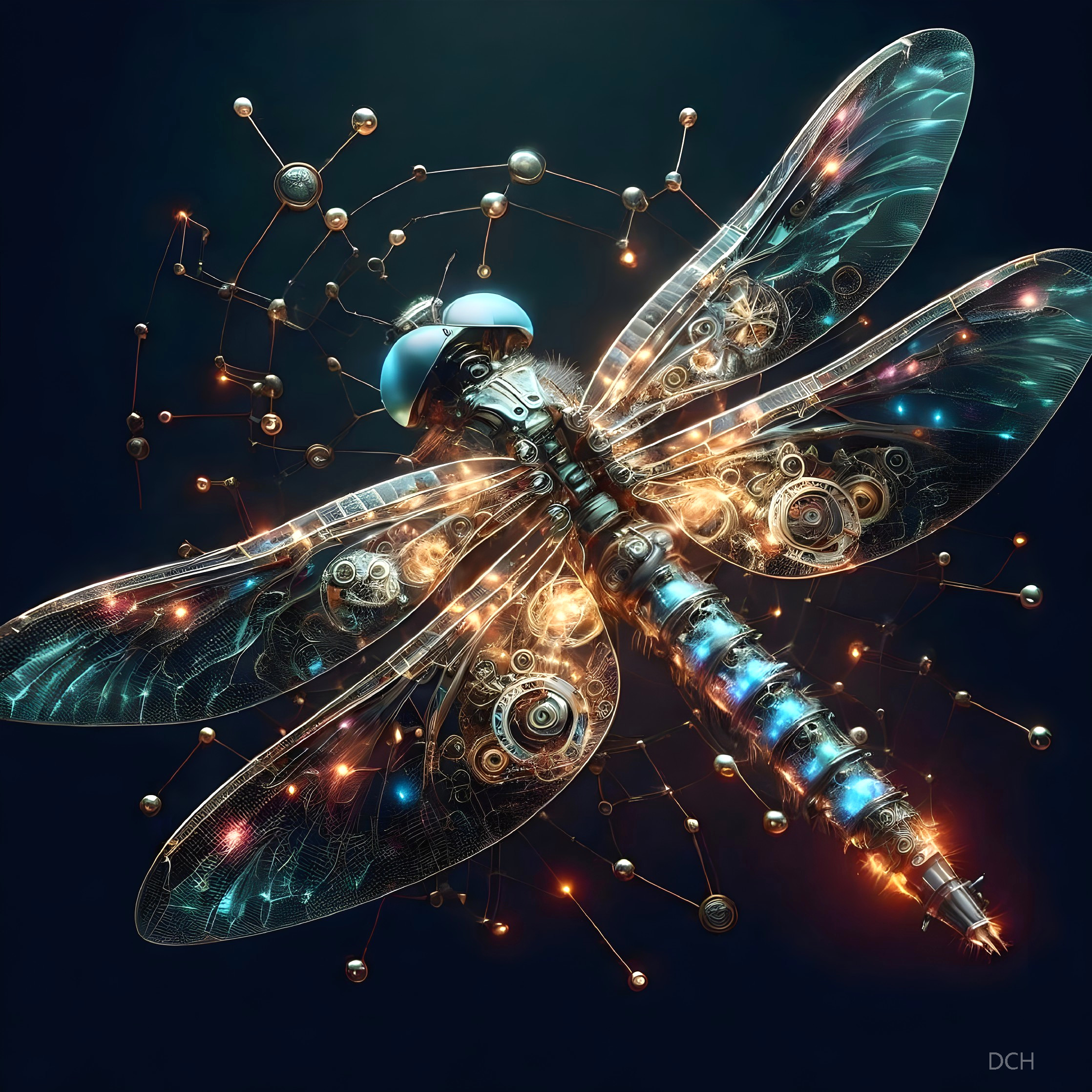 Steampunk-inspired dragonfly with mechanical gears and molecular structures
