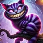 A whimsical, colorful cat with a mischievous grin perches on a tree branch under a vibrant, starry sky. Its fur glows in shades of purple and blue, with a large moon illuminating the scene.