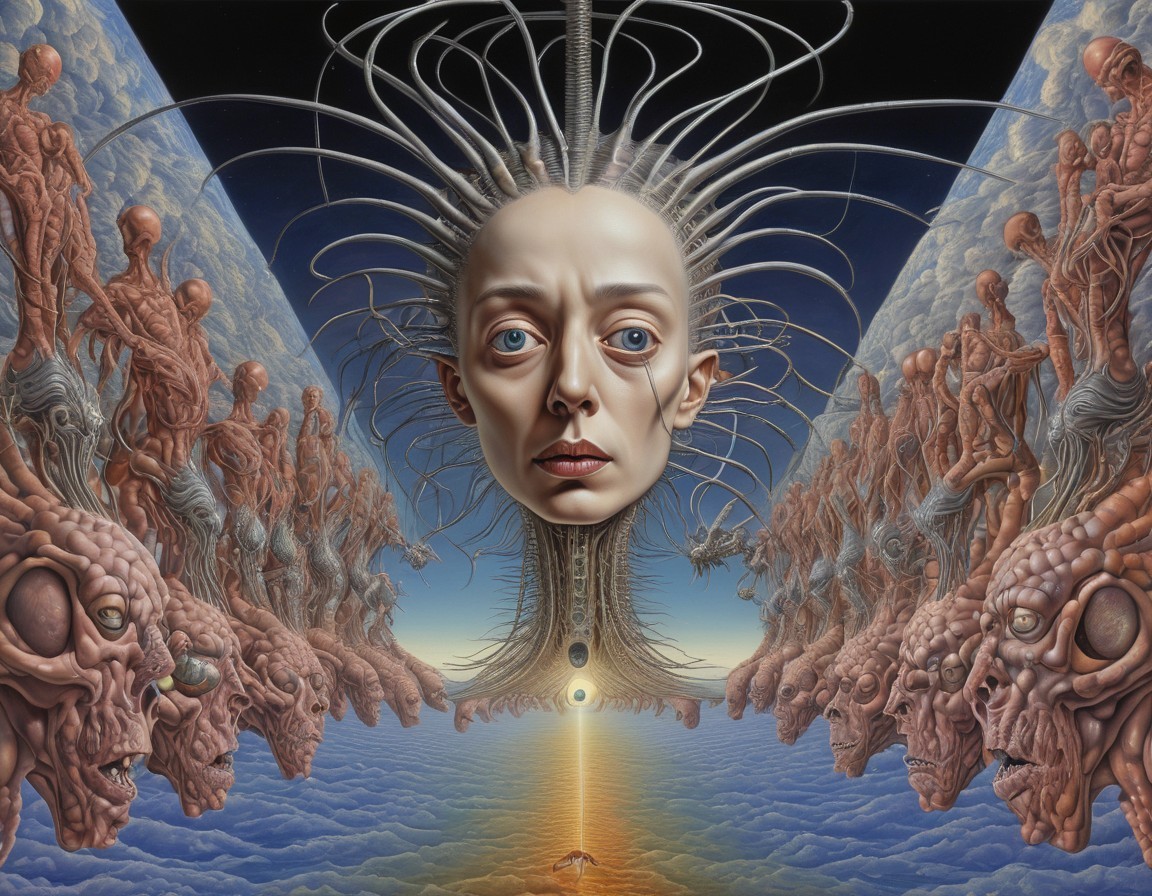 A surreal portrait featuring a person with an elongated neck and intricate headdress, surrounded by fantastical, organic patterns and forms.