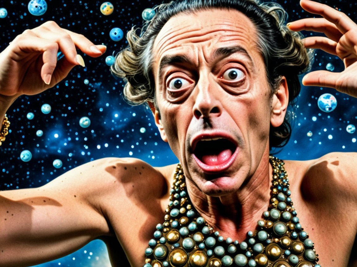 A surreal scene depicts a man with wild hair and an exaggerated expression, surrounded by whimsical, floating robotic spheres against a vibrant, oceanic backdrop.