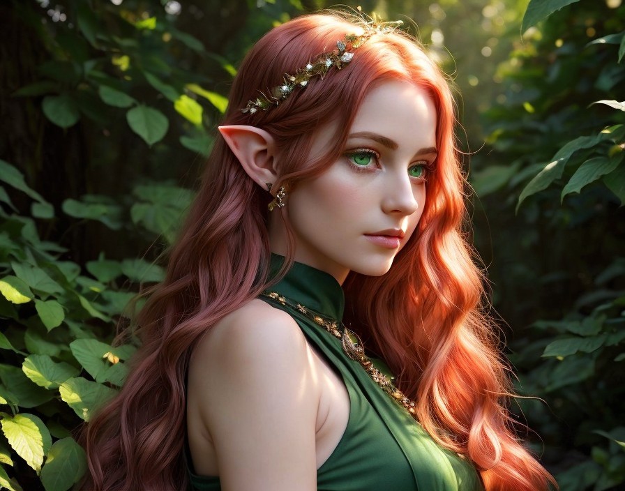 A digital art piece of a woman with pointed ears, red hair, green eyes, wearing a leafy crown, set against a lush, green forest backdrop.