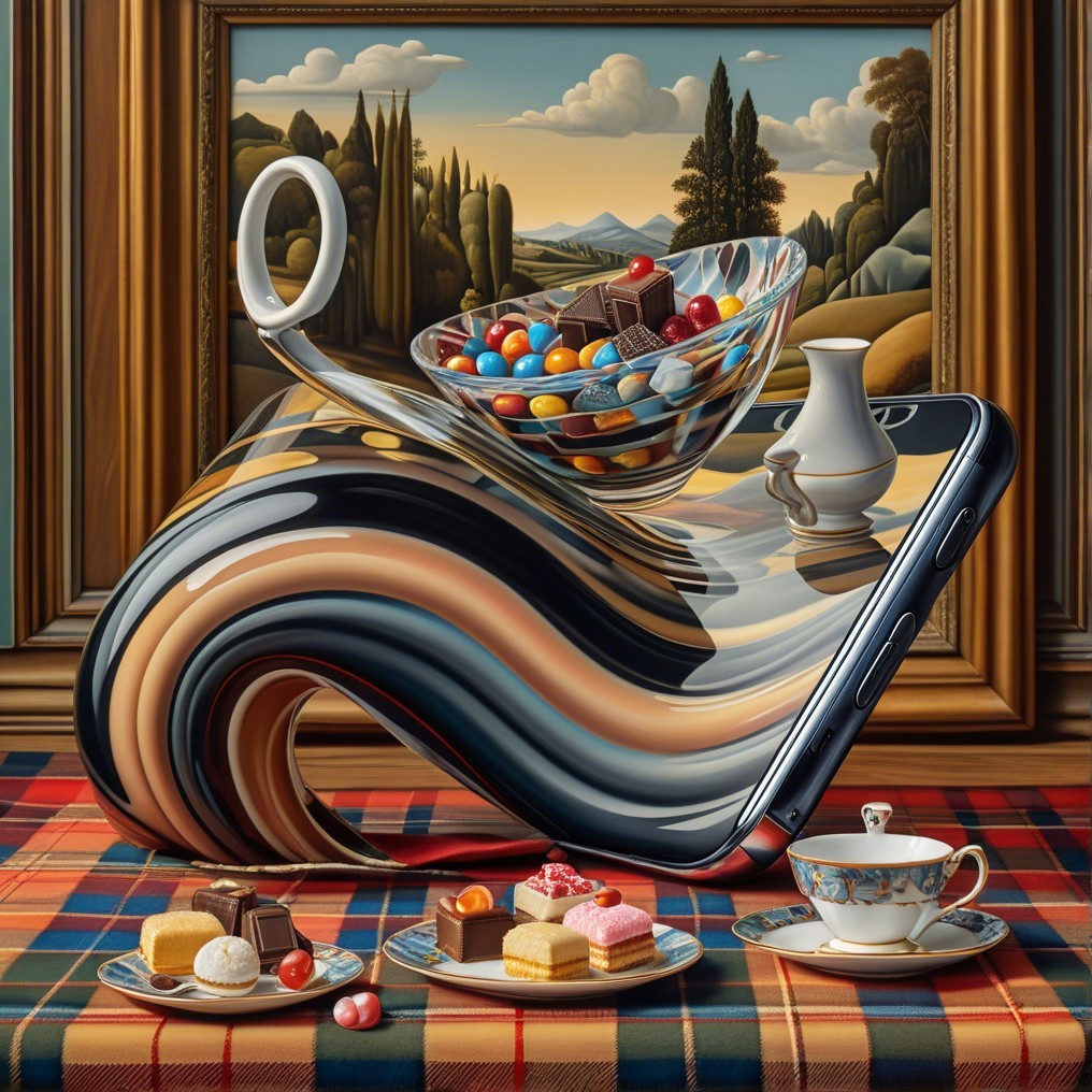 A surreal scene features a flowing, striped phone serving as a tabletop for a colorful bowl of candy, a porcelain tea cup, and an assortment of pastries, all set against a picturesque landscape.