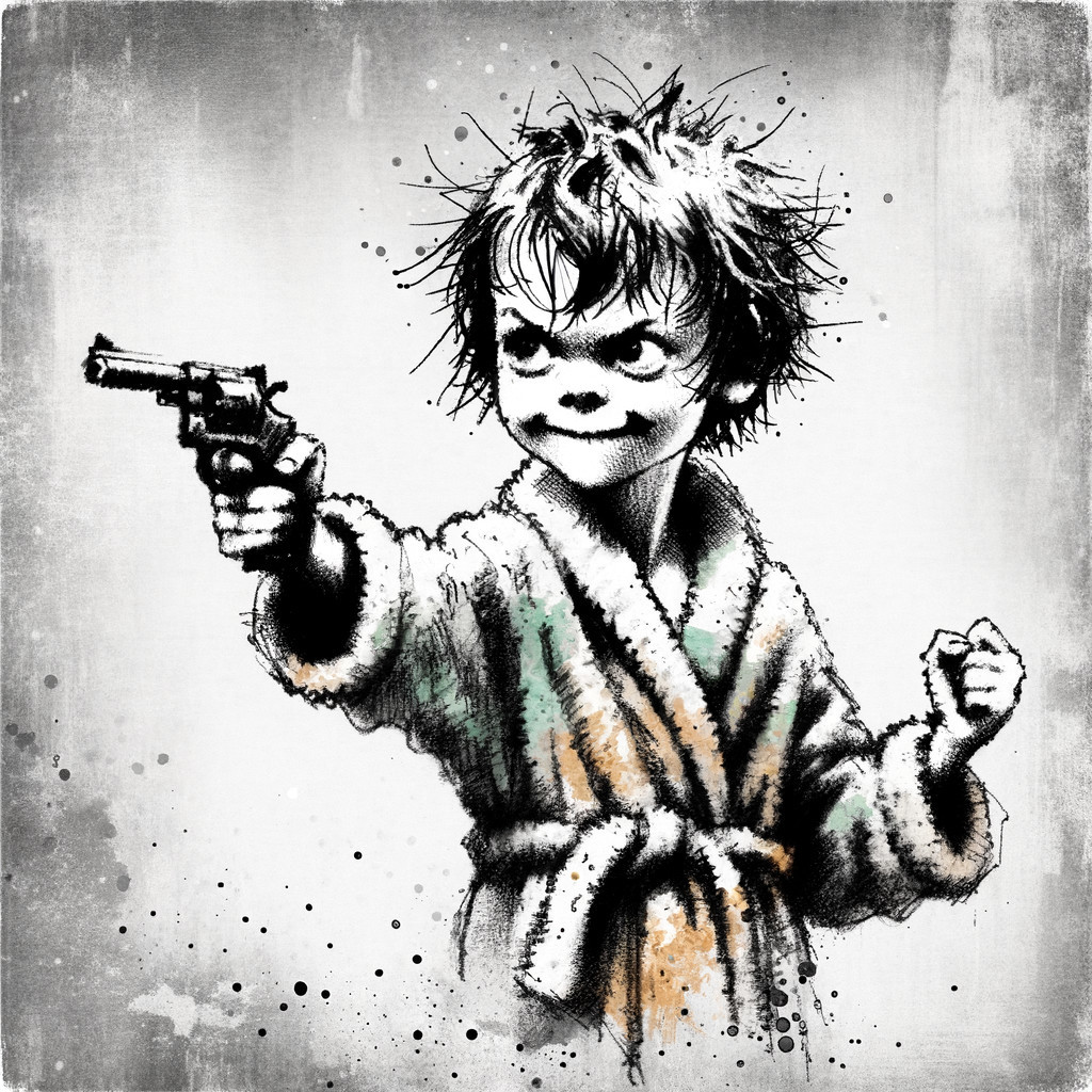 Prompt: "A cartoon determined cartoon girl with wild short hair pointing a gun at the camera, skinny, disheveled, shaggy, in a bath robe with wet hair after a shower. Caricature. In the style of a child's drawing. Minimalism, simplicity, naive, charcoal drawing, whirlwind of colors, gray soot, sketching, bleached background, grunge, alcohol ink, play of light and shadow, quick sketch, unusual horror, watercolor, dark art. An abstract illustration, urban fine art at its best. Contemporary graphic. Drawing, painting, scribbling lines and strokes. Great energy and movement. Style of Victor Sheleg and Russ Mills. Black and orange on a white background."