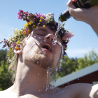 A young man stands under a shower, water cascading over him. He has wet, tousled hair and a focused expression, exuding confidence against a backdrop of nature. Sunlight enhances the scene.