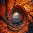 The artwork features a woman framed by vibrant orange leaves, gazing thoughtfully. Behind her, a celestial scene with a blue planet hints at a connection between nature and the universe.