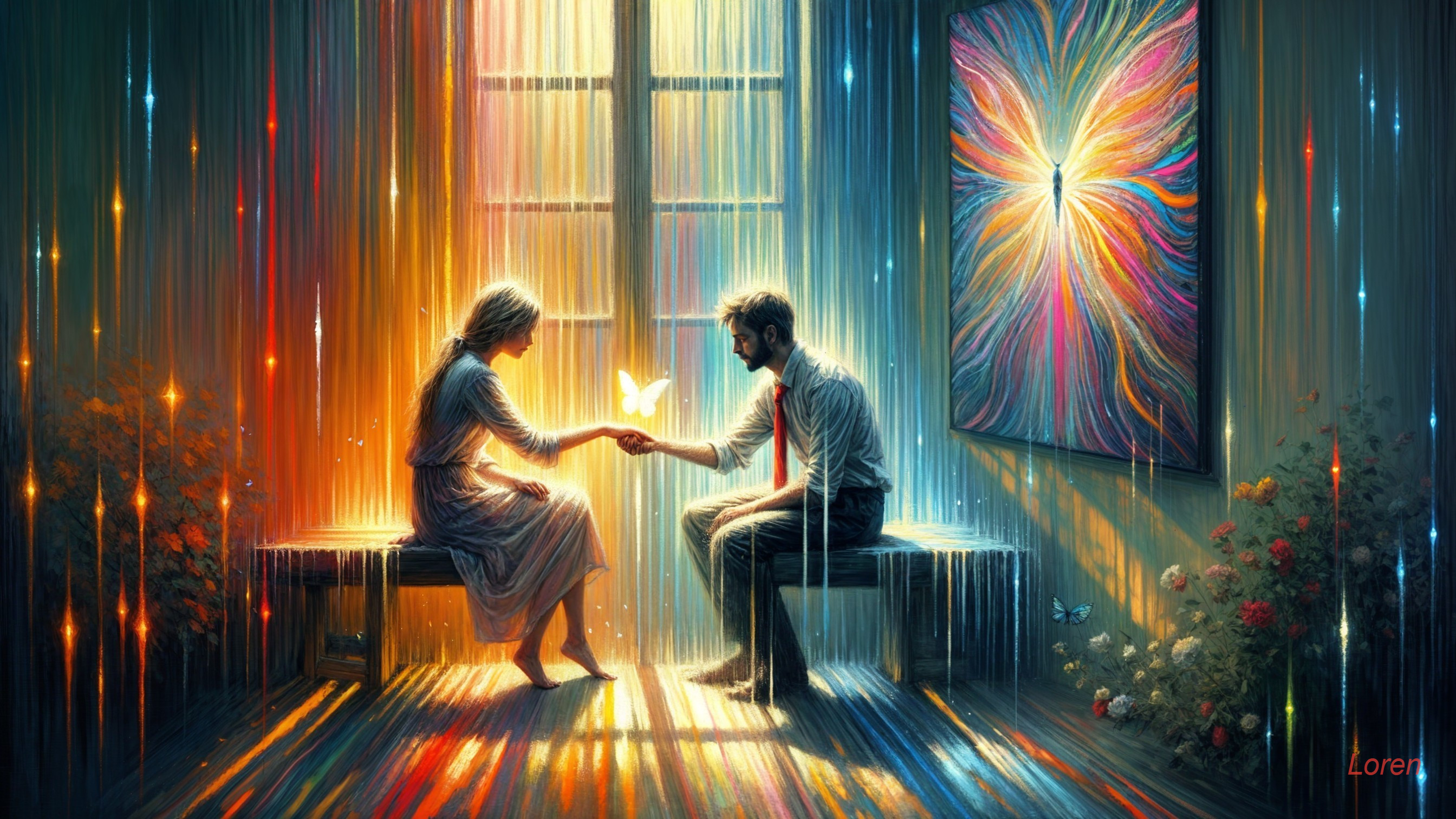 A romantic moment between a young couple, their foreheads touching against a scenic backdrop of ocean and sky, with butterflies gently fluttering around them, creating a dreamy atmosphere.