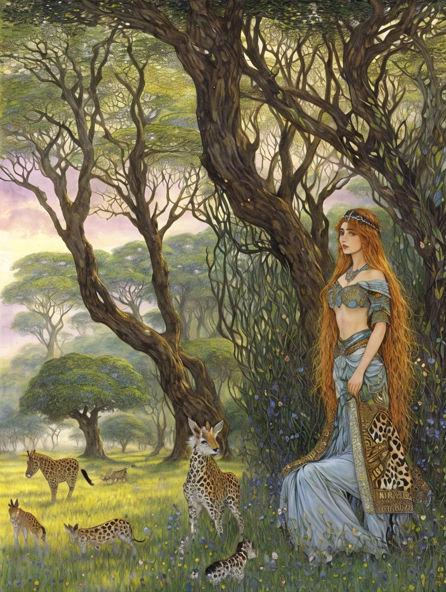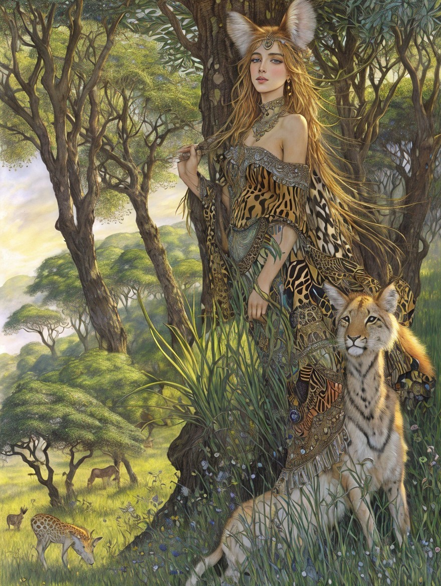 An elegant woman with a golden headwrap and blue draped clothing adorned with jewelry stands contemplatively in a savanna landscape.