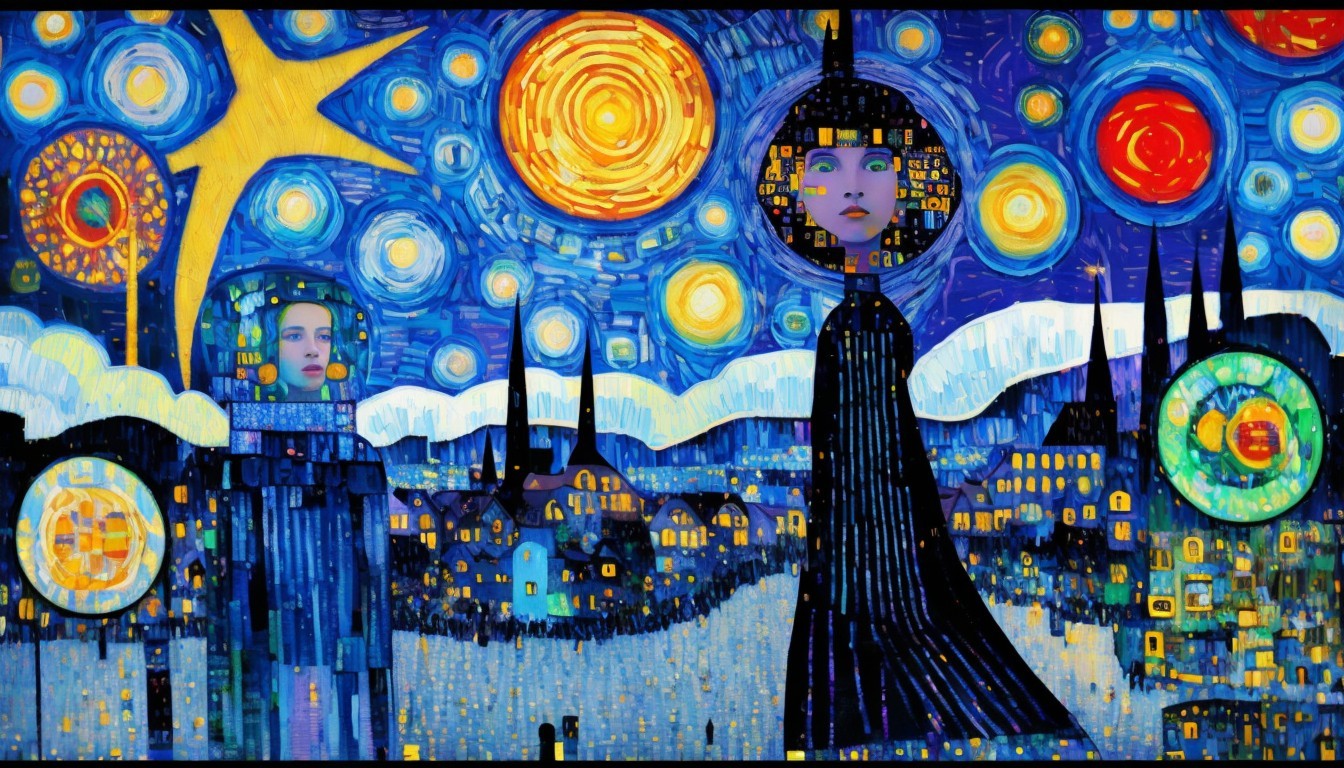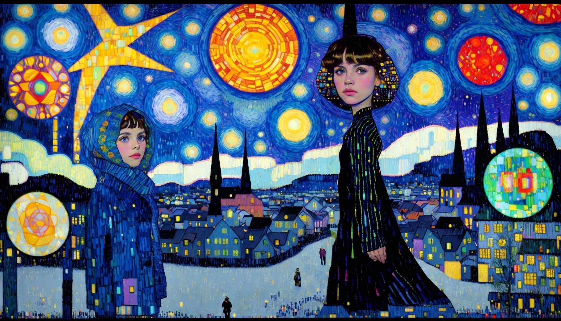 A vibrant, whimsical scene featuring two women in a starry night landscape. One wears a blue scarf, while the other dons a witch's hat, set against a colorful, swirling sky and quaint buildings.