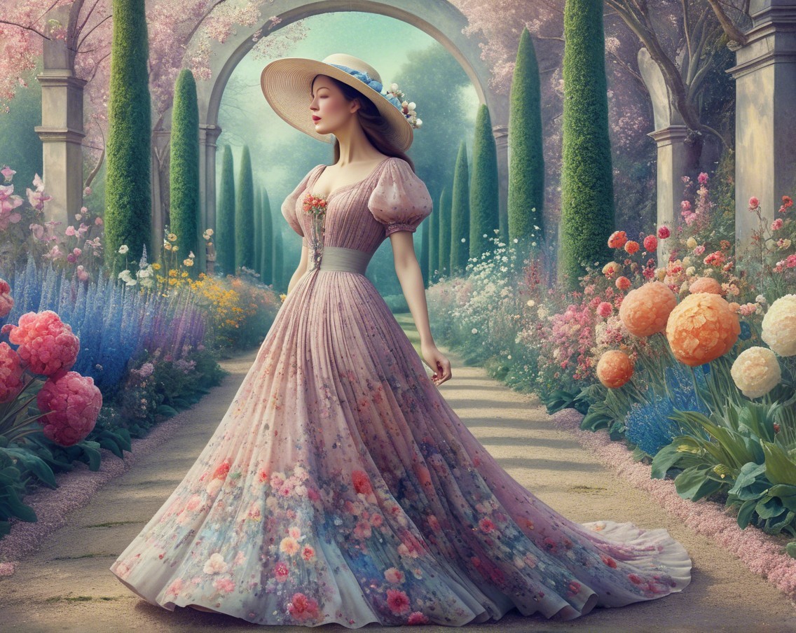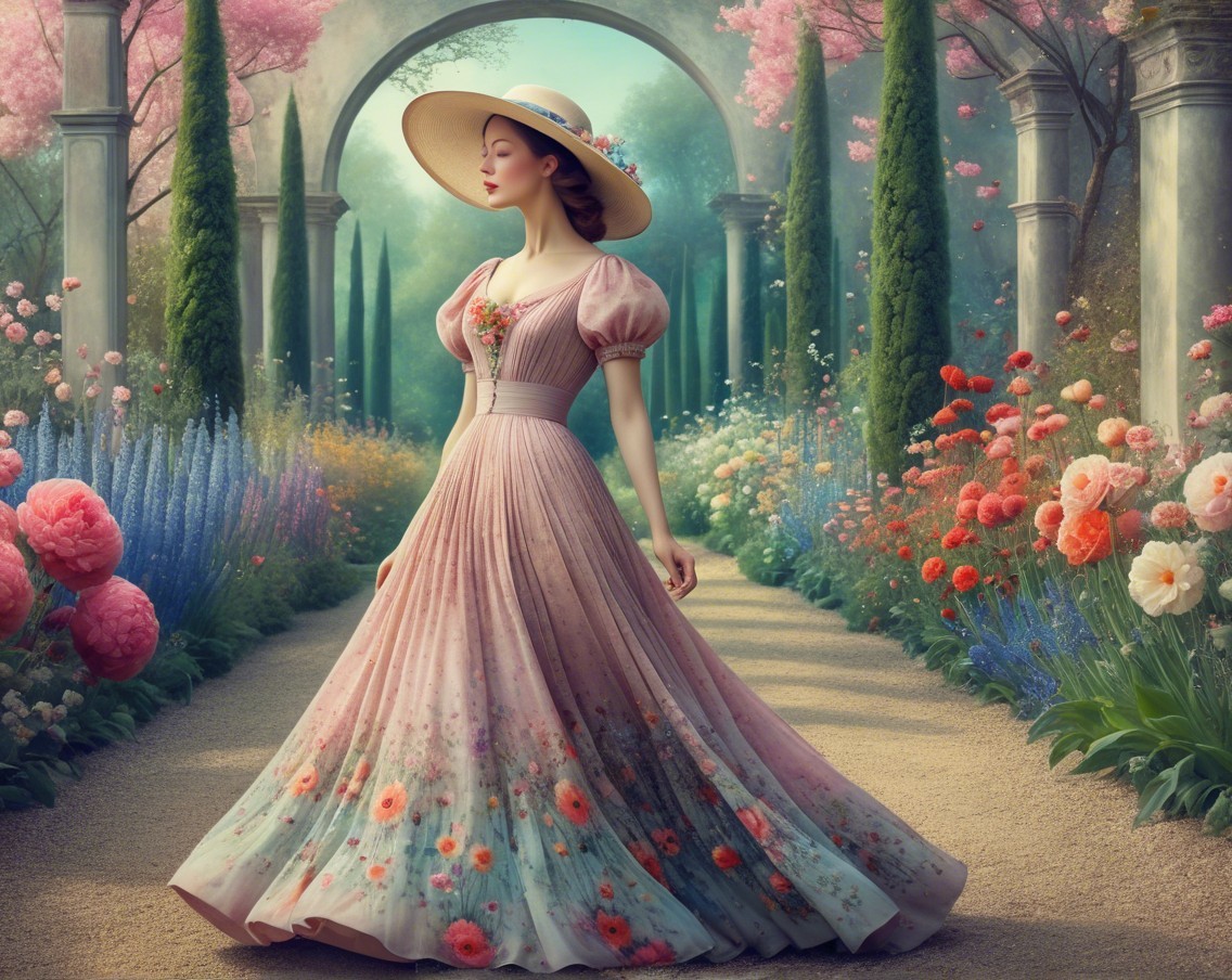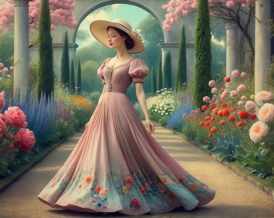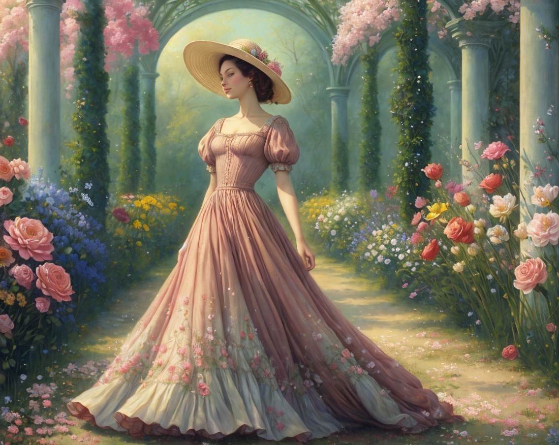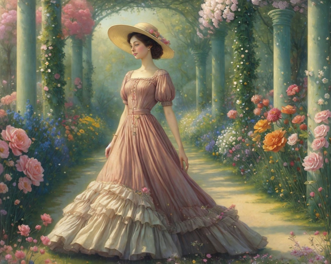 A graceful woman in a flowing pink dress strolls down a flower-lined path. She wears a wide-brimmed hat adorned with flowers, surrounded by vibrant blooms and lush greenery.