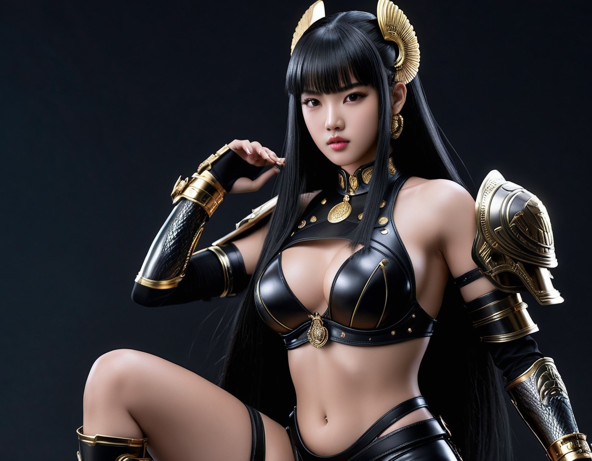 The image features a figure in intricate armor, characterized by ornate golden details and a sleek, powerful pose. The dark background accentuates the striking design and confident stance.