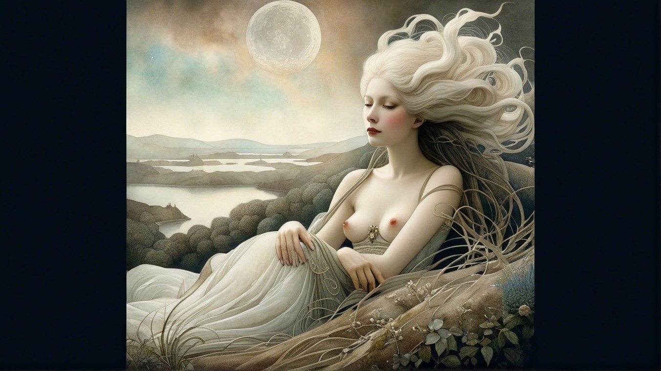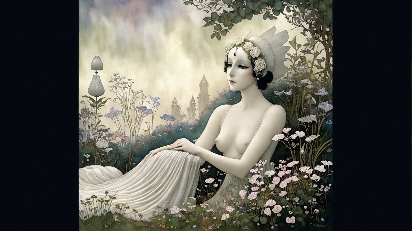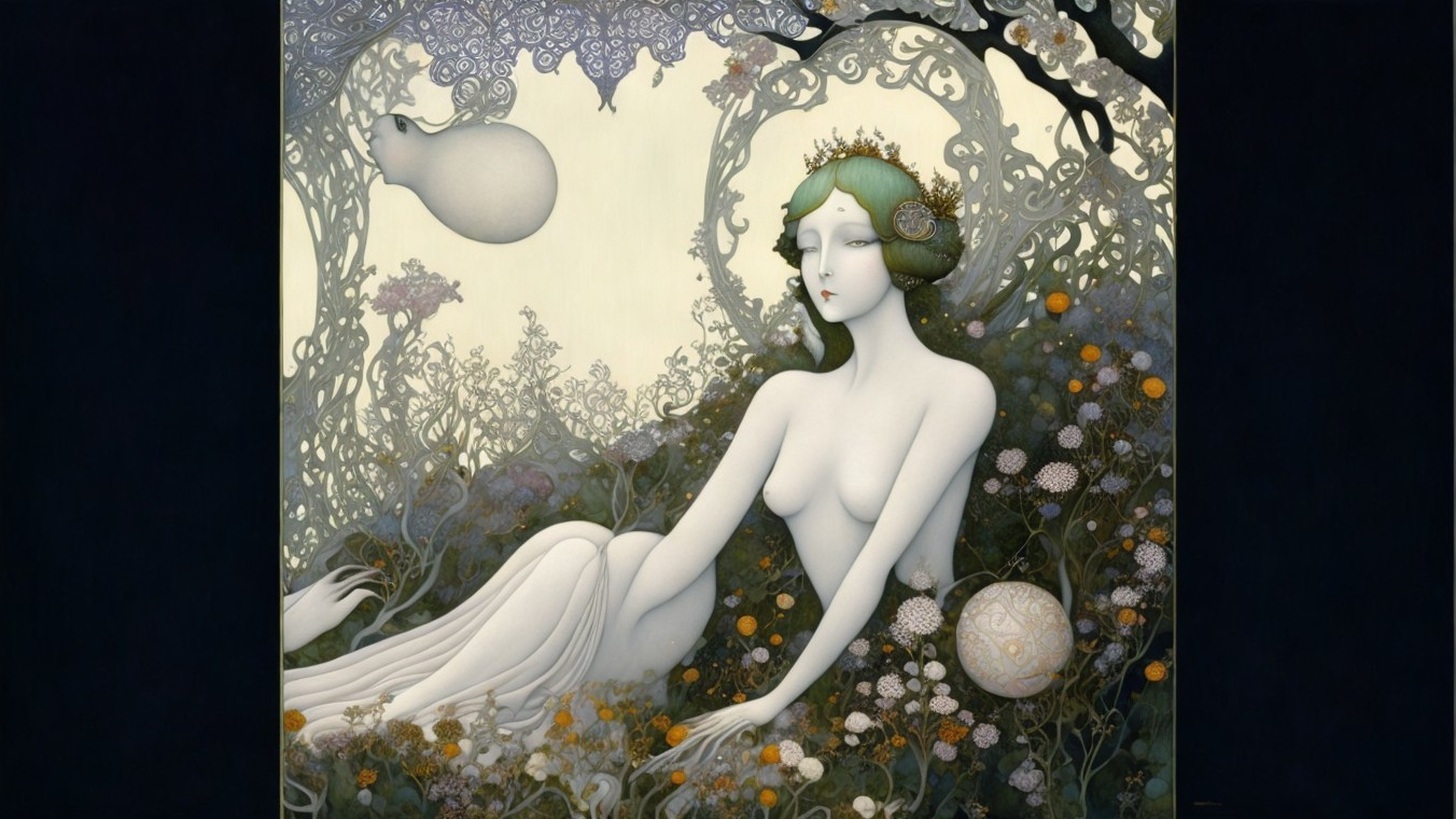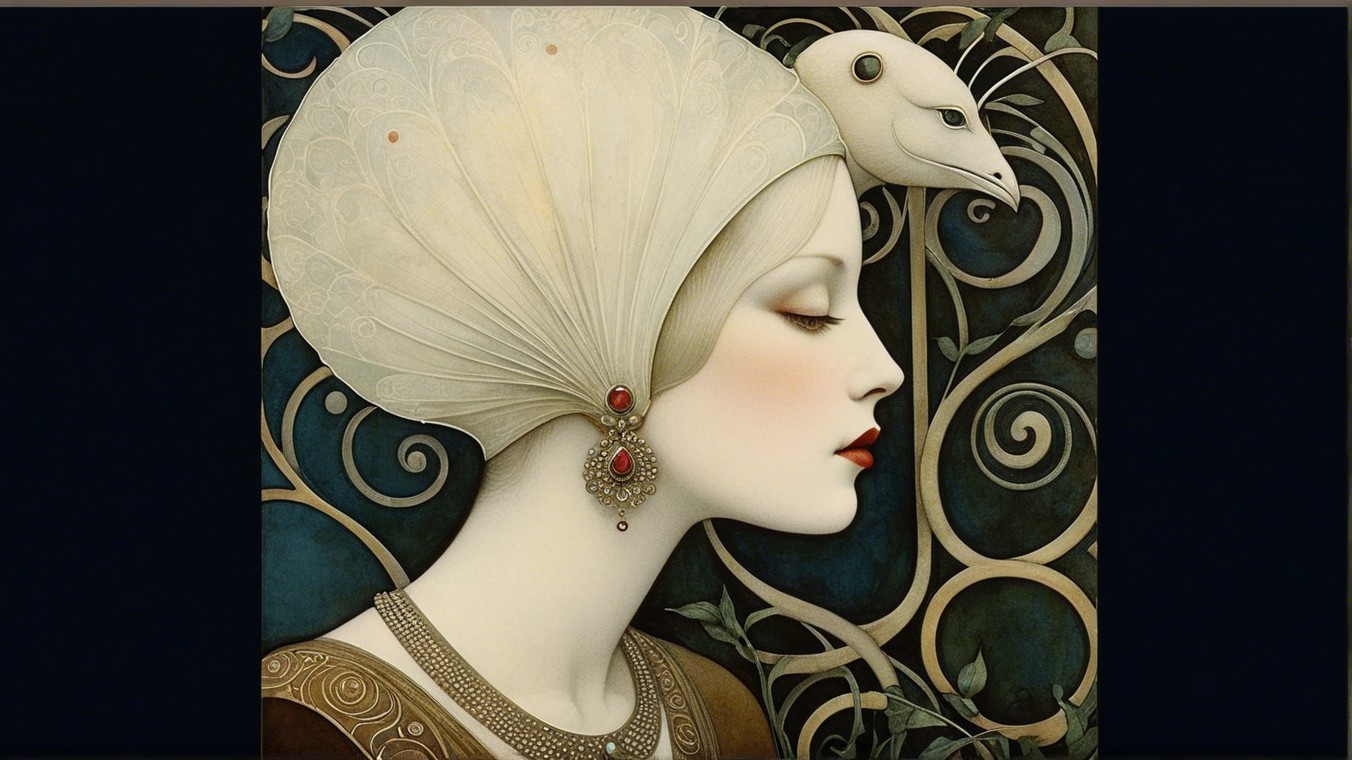 A stunning portrait of a woman with elegant blond hair and ornate styling. Her expressive eyes and striking red lips are complemented by intricate patterns and a dark background, creating a vintage vibe.