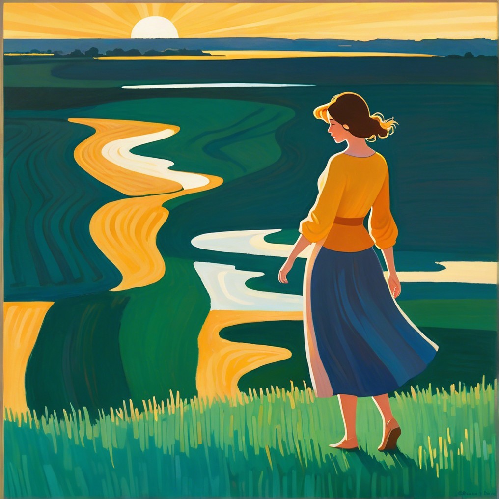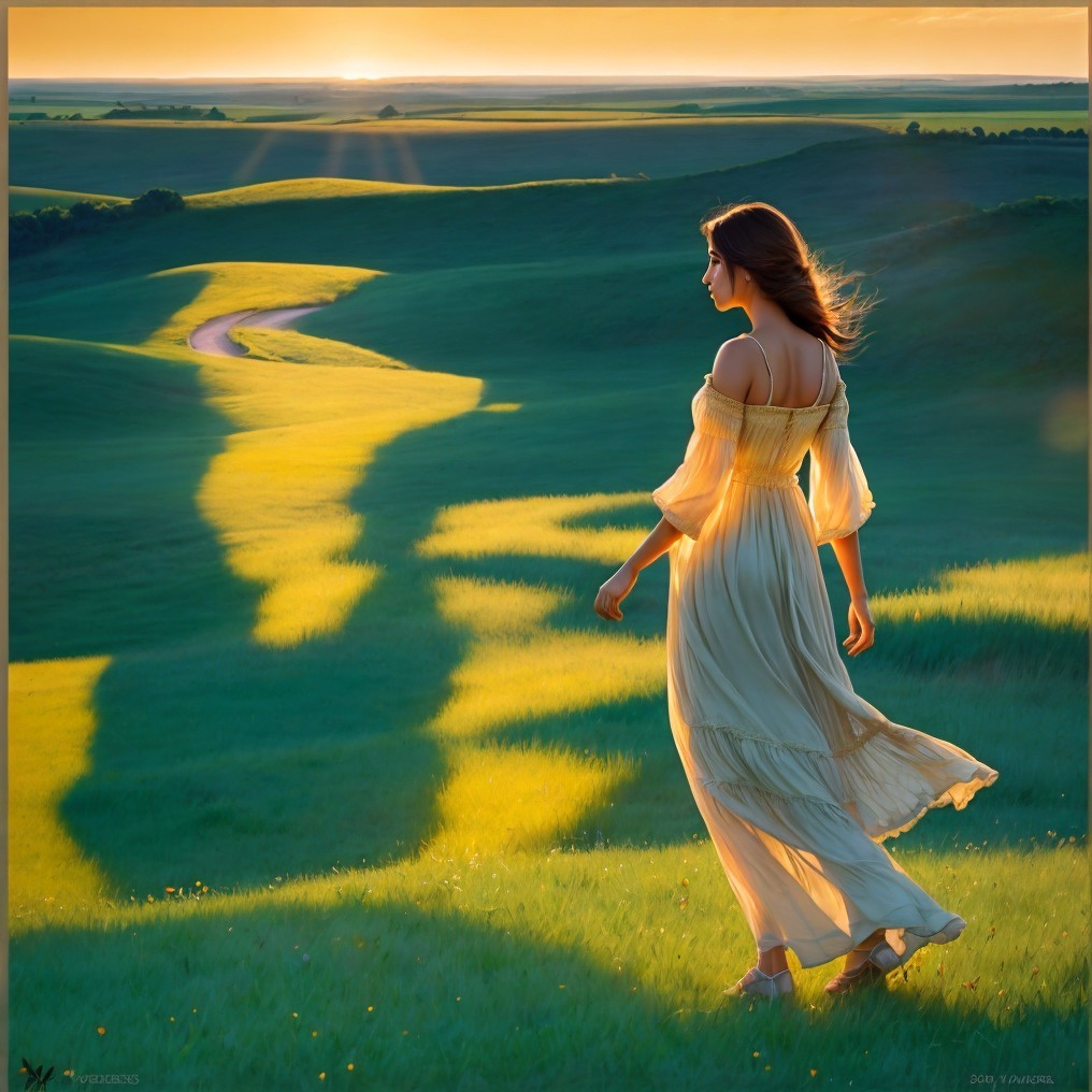 A woman in a flowing white dress walks through sunlit hills at sunset, with soft golden light illuminating the landscape and creating a serene, peaceful atmosphere.