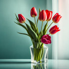 A vibrant bouquet of multicolored tulips fills a glass vase, showcasing red, pink, and yellow blooms. Soft light casts gentle shadows, enhancing the elegant arrangement.