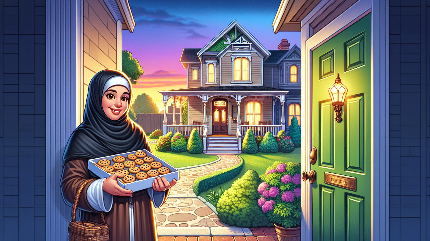 A young woman stands at a door, holding a tray of freshly baked cookies. Behind her, a beautiful house with a manicured lawn and a colorful sunset creates a warm, inviting atmosphere.