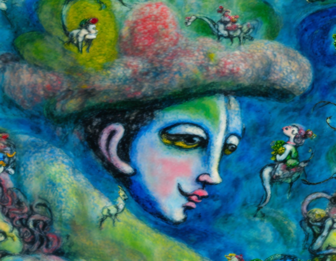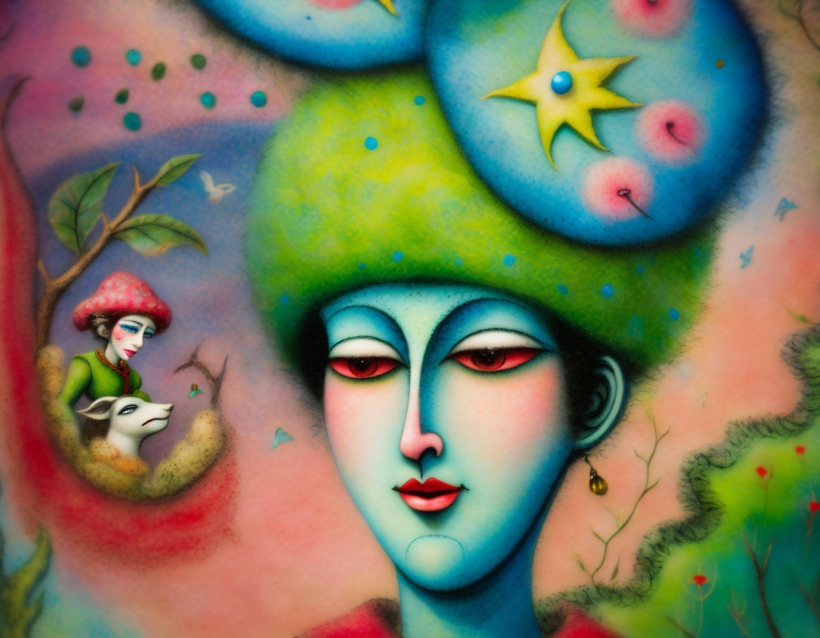A whimsical scene features a girl with striking features in a colorful, forest-like setting. She wears a vibrant blue dress and a decorative red hat, surrounded by playful butterflies and surreal trees.