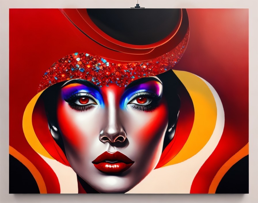 Colorful, stylized portrait of a woman with vibrant makeup and an ornate headdress against an abstract background.