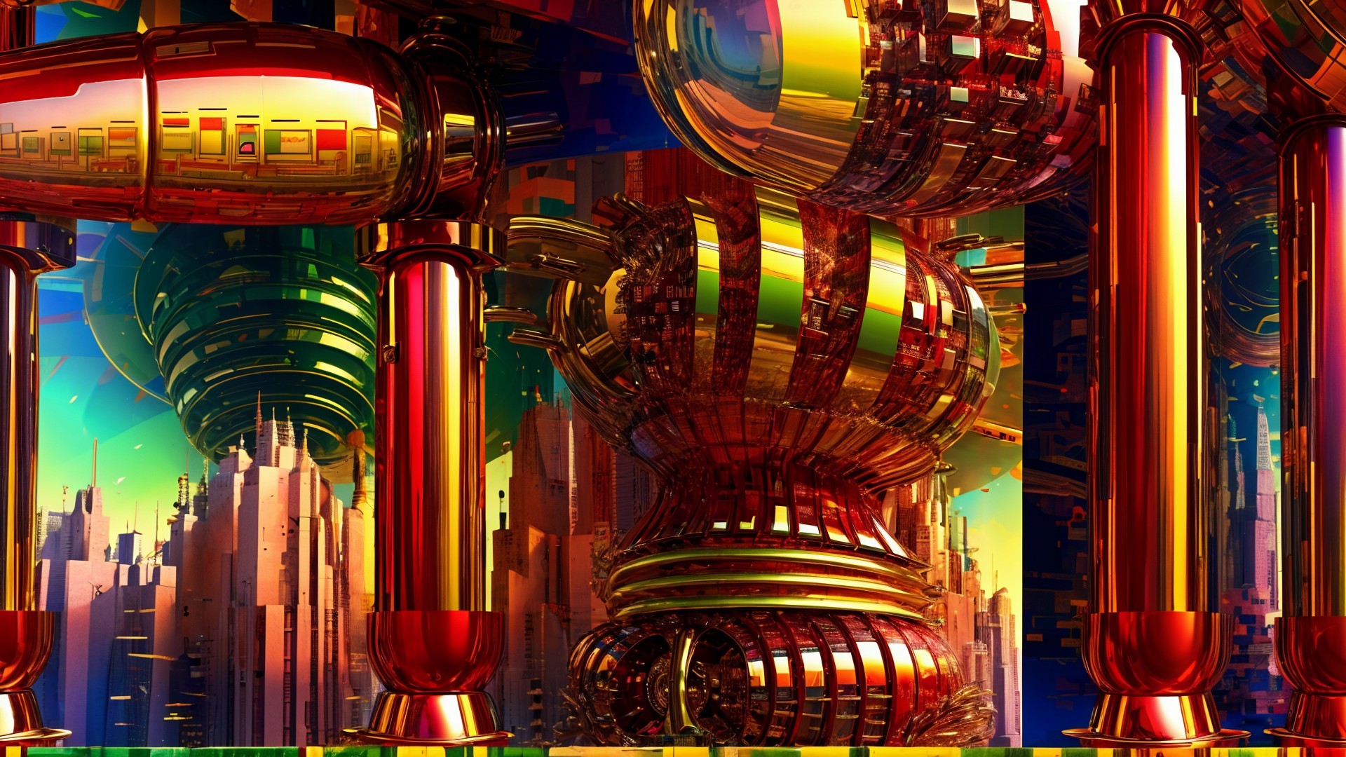 A surreal urban landscape features vibrant, glossy structures in various shapes, reflecting colorful patterns on still water, set against a skyline with modern skyscrapers in the background.