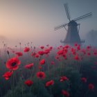 A serene landscape at dawn features a colorful field of poppies swaying gently in the breeze. In the background, a windmill stands tall amidst a soft, misty atmosphere, while a scarecrow watches over.