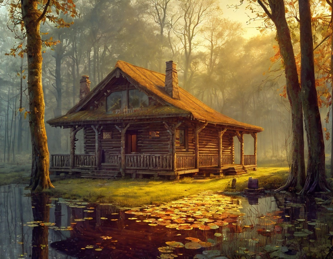 Prompt: Log cabin by the overgrown pond in the autumn forest, early morning, sunrise, autumn, wet brush effect, intricate, by John Atkinson Grimshaw, by Gerald Brom, by Ivan Bilibin