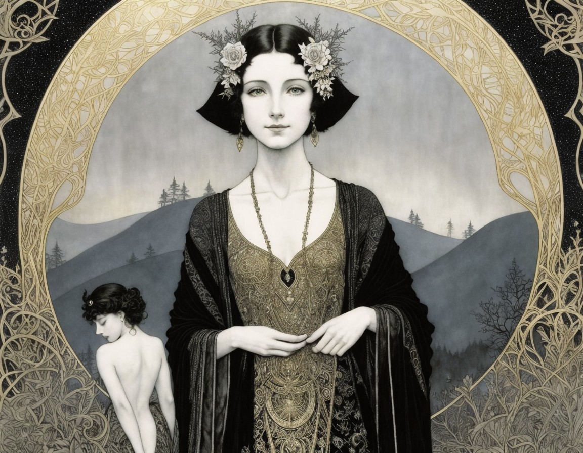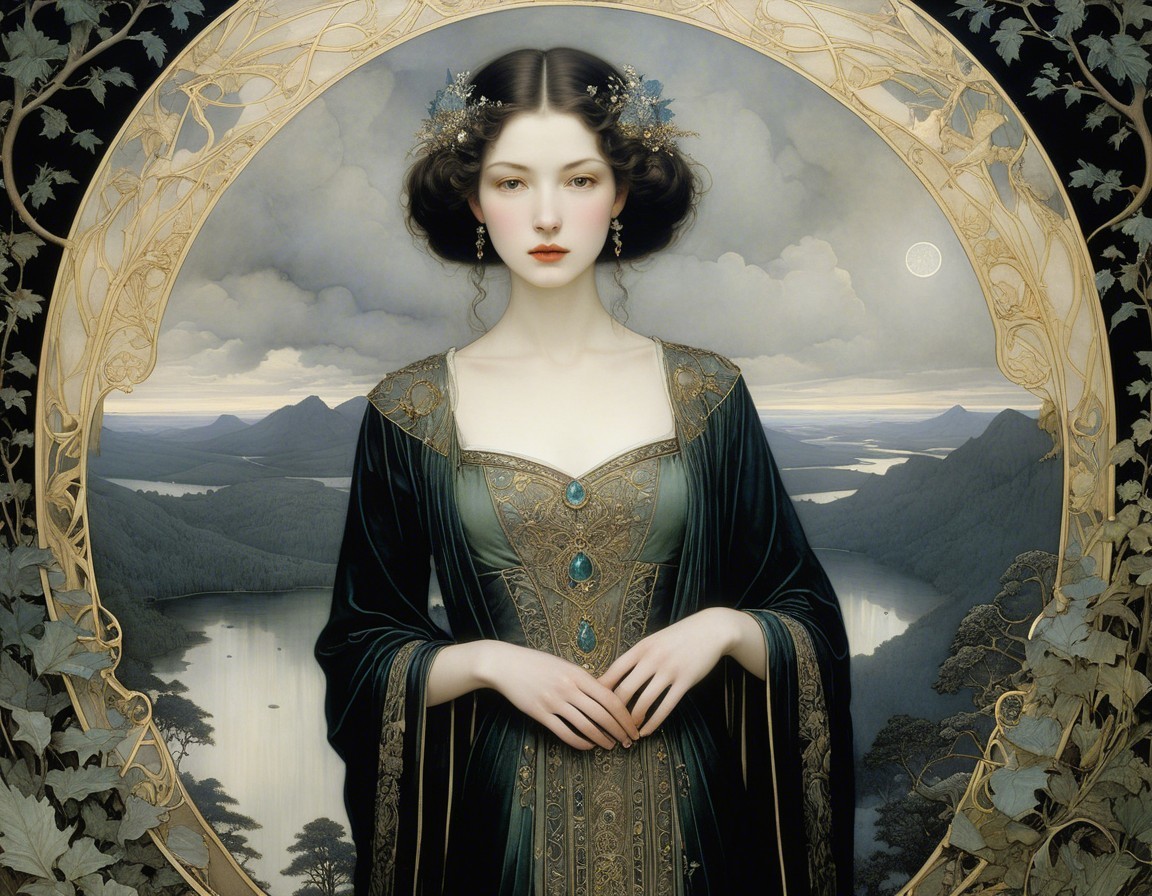 A serene woman in a lush green gown stands before a mystical landscape, surrounded by ornate patterns. Her elegant features and calm demeanor evoke a sense of timeless beauty and enchantment.