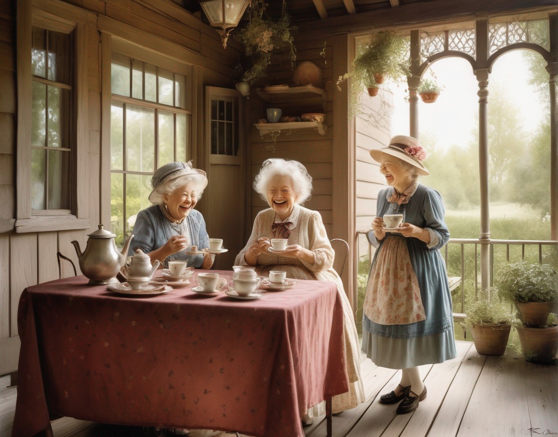 Three women in vintage clothing enjoy tea and laughter on a sunny, rustic porch overlooking a garden.