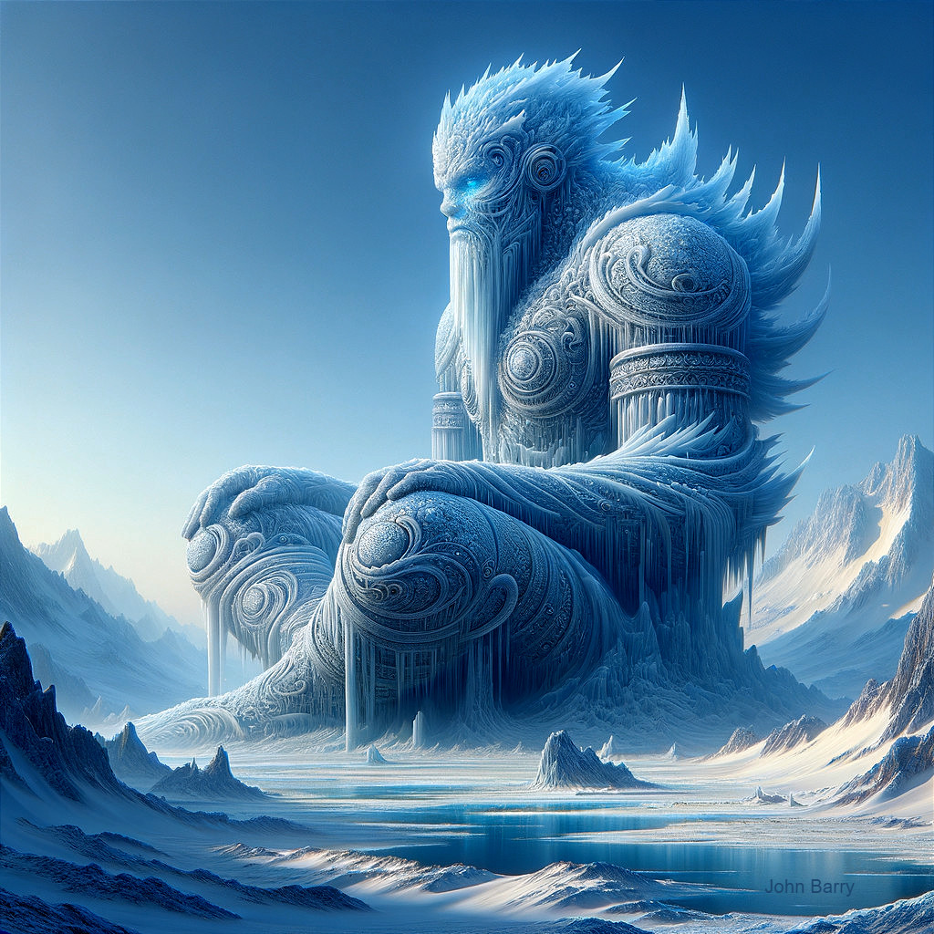 A colossal ice giant sits majestically in a frozen landscape, intricately carved with patterns. Blue light emanates from its eyes, contrasting against the serene snowy mountains and icy waters.