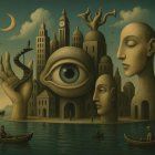 A surreal landscape features a giant eye and faceless figures emerging from a tranquil harbor. Unique architecture and swirling staircases blend with a dreamlike sky, evoking introspection and mystery.