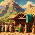 A vibrant marketplace in a mountainous area, featuring locals in colorful traditional attire selling fresh vegetables under a straw roof, with terraced fields and ancient ruins in the background. Note: This image is considerably confused in that the people are dressed in various styles, the location invokes Inka territory , and the people are wearing tropical Asian hats.