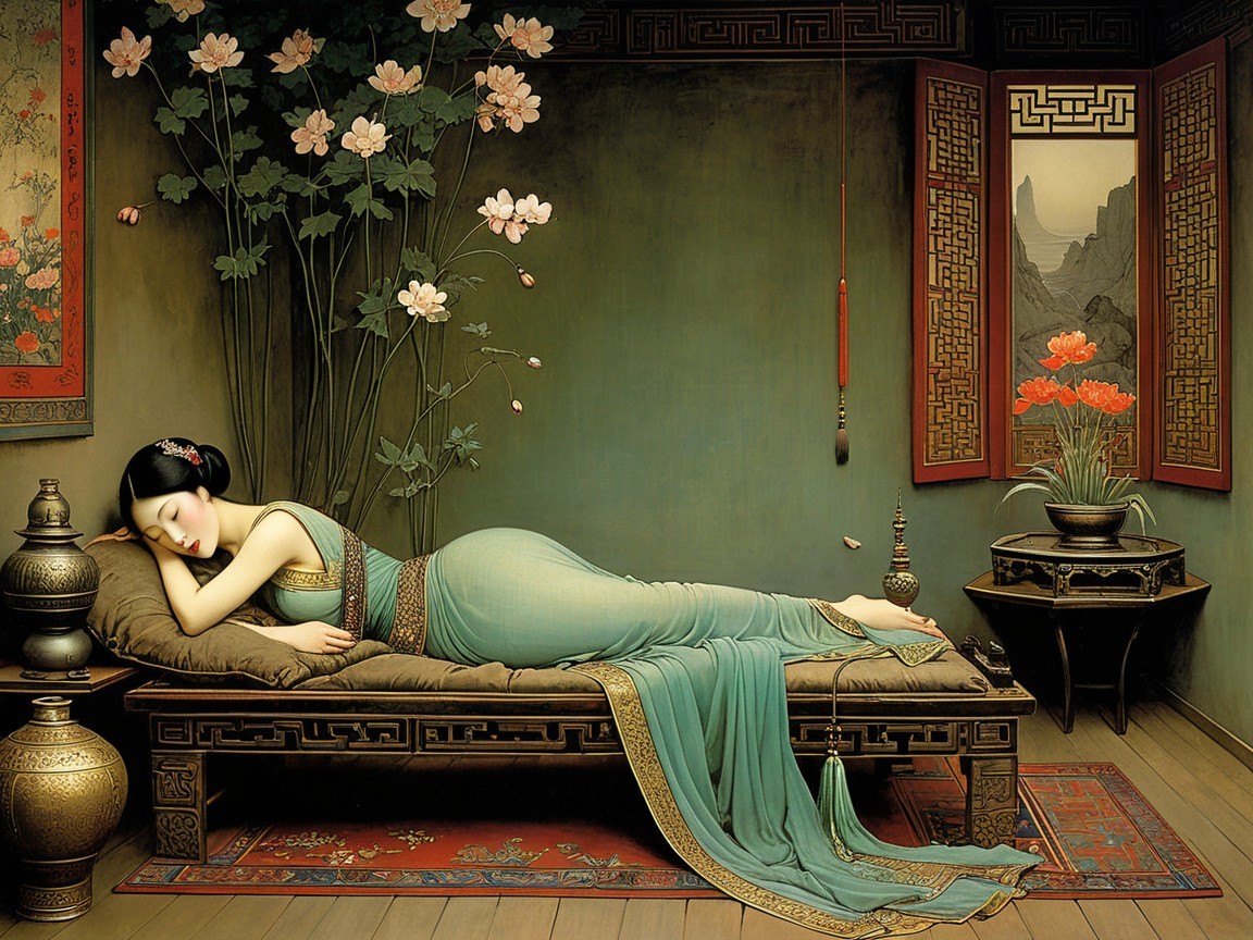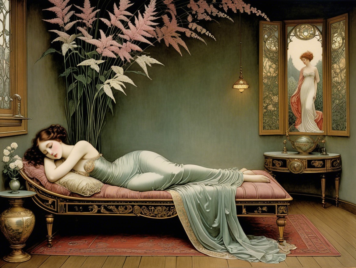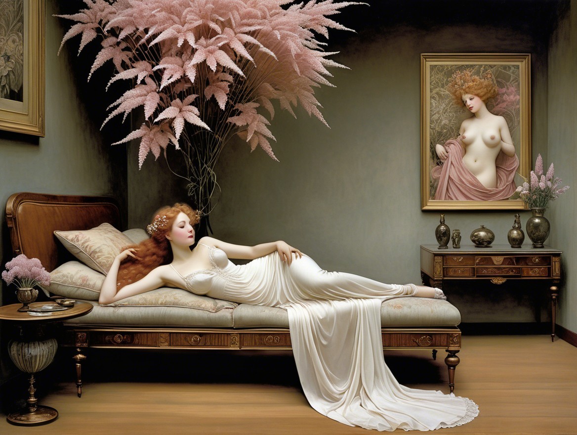 A serene woman with flowing red hair lounges gracefully on an ornate chaise, wearing a delicate white gown. Surrounding her are lush plants and blooming flowers, creating a tranquil atmosphere.