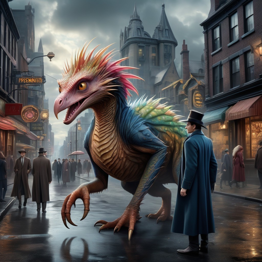 A colorful, feathered creature resembling a dinosaur stands on a rainy, cobblestone street among people in vintage attire.